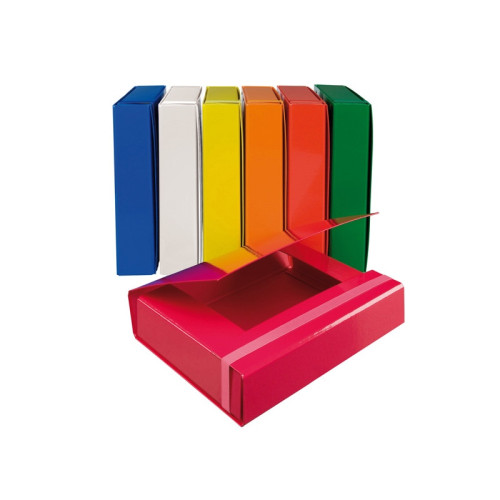 Škatla za shranjevanje z elastiko, prekrita z enoslojno plastificirano rdečo barvo.