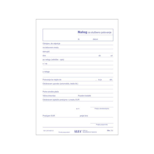 Nalog za službeno potovanje – samokopirni (blok A5, 100 listov)