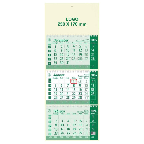 Tridelni stenski koledar EKO Zelen 2026 je odlična izbira za vse, ki želite preglednost, naravne materiale in profesionalen videz. Zaradi svoje ekologične zasnove in velike površine za pregled datuma je popoln za pisarne, recepcije in delovna okolja.